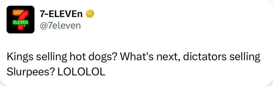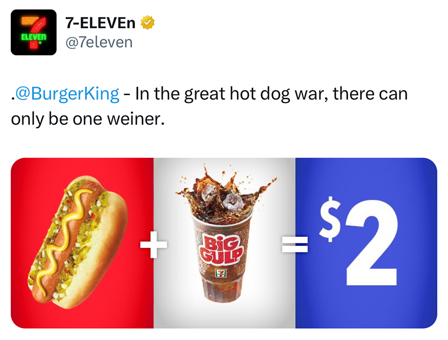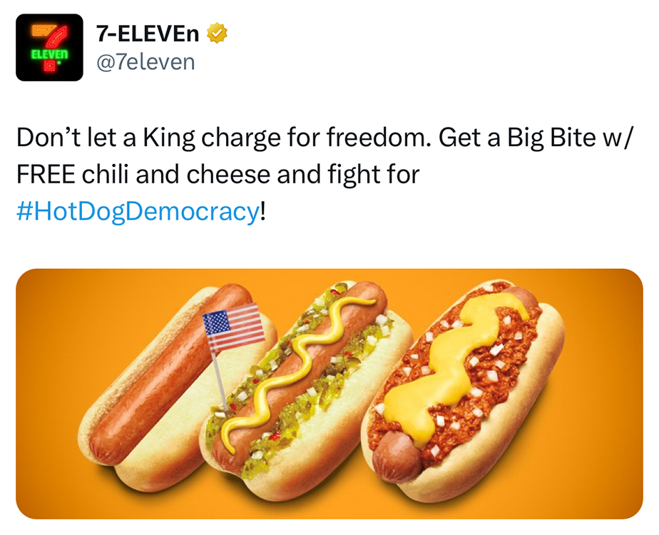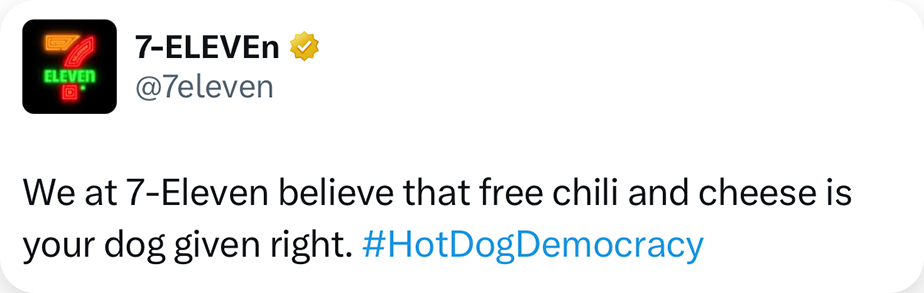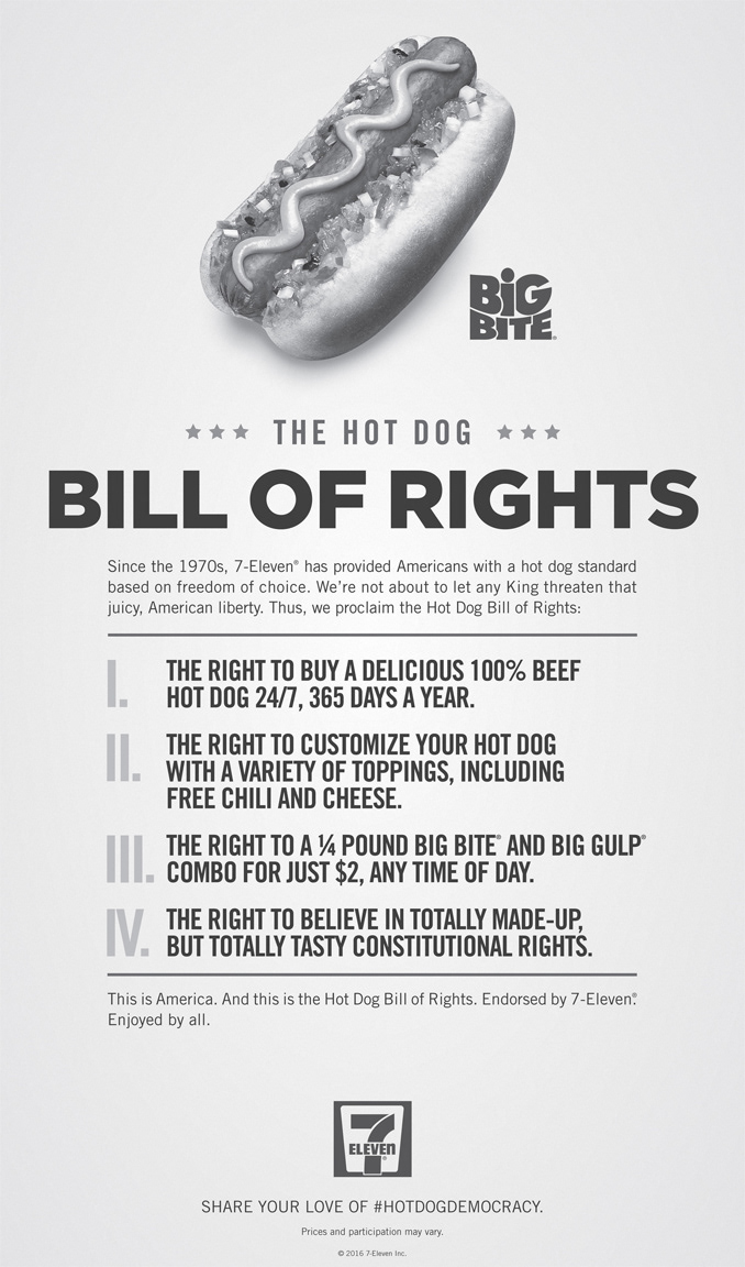When Burger King announced it would start selling hot dogs, 7-Eleven, America's biggest fast-food hot dog seller, saw this as a declaration of war. What do kings know about hot dogs? Or America, for that matter? On the first day of BK's hot dog sales, we released 7-Eleven's Hot Dog Bill of Rights in local papers and demanded #HotDogDemocracy on our social channels and through paid media. The story took off through news outlets. And when Eater mentioned on their socials they're going to review the BK hotdog downtown, we waited for them with free 7-Eleven hot dogs outside. They declared us the winners. Or wieners. Long live democracy!